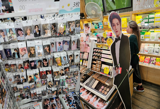 In 2016, a renewed interest in K-pop emerged owing to the global success of idol groups like BTS and Blackpink, leading to a 3rd Korean Wave Boom. Shin-Okubo, seeing this new opportunity to revitalize their district, transformed from a Korea space to a K-pop space. Within the revitalized Shin-Okubo, K-pop is integrated in the streets and establishments. Hangeul, the Korean writing system, is used to add to the ‘Koreanness’ of the space. K-pop songs are playing, several cutouts of K-pop idols are on display, K-pop idol trainees walk by, and various merch for different idol groups are being sold throughout the space. This is a place where fans can practice oshikatsu (推し活) or the act of supporting their favorite idols through the consumption of goods for the purpose of popularizing and investing in them.